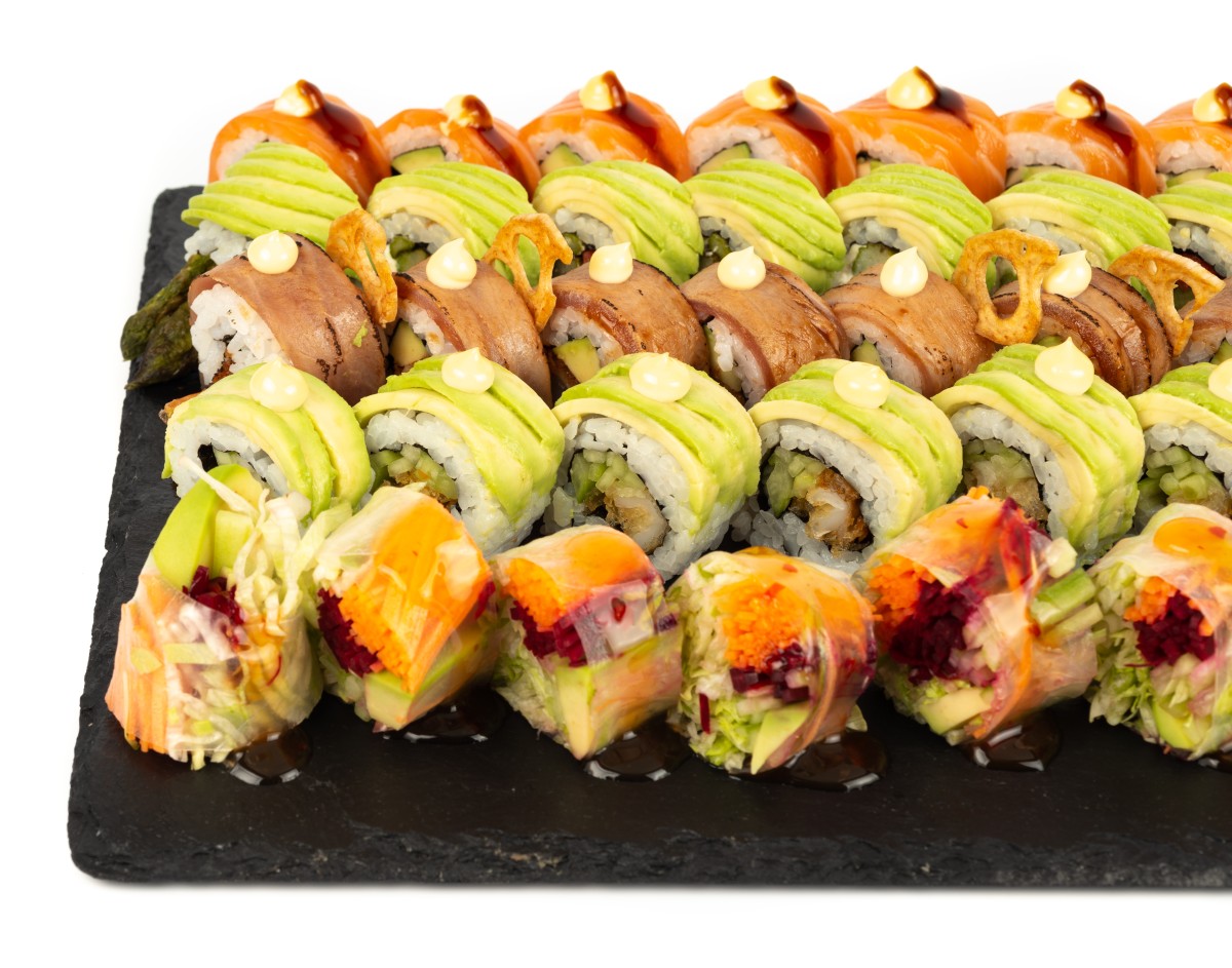 лаврак с манго - 8 бр., телешко с мус от скариди - 8 бр., рейнбоу ролл - 8 бр., кабаяки байтс - 6 бр..